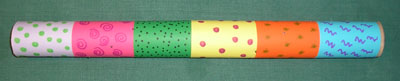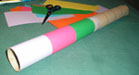 En acabat, agafem els papers de colors i comencem a folrar el tub. Aquesta vegada hem posat els colors de paper un al costat de l’altre, però podem fer el que més ens agradi: posar-los de forma diagonal, retallar-los a trossets o enganxar-los amb pega.